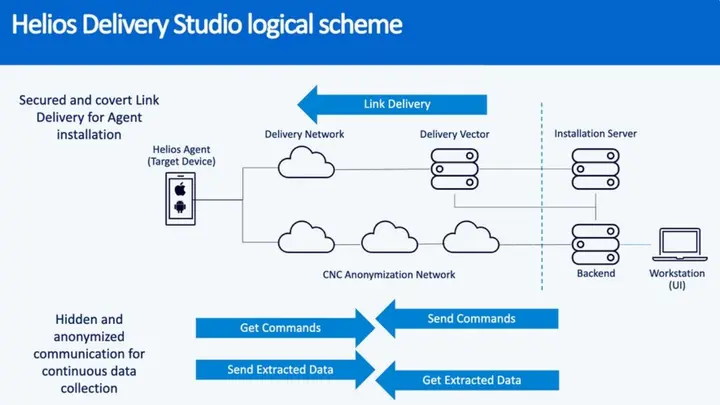 تعتمد الشركة في هجماتها على روابط تُرسل مباشرة عبر تطبيقات الرسائل المشفرة أو منصات أخرى وتستخدم أدوات لإخفاء النشاط مثل وحدة Watcher لمراقبة الجهاز ووقف الاستغلال عند اكتشاف نشاط مشبوه ووحدة Helper لتسجيل المحادثات تتبع لوحة المفاتيح والتقاط الصور. كما يتيح البرنامج للمهاجم التحكم في الميكروفون والكاميرا لاستخراج معلومات حساسة دون علم المستخدم.