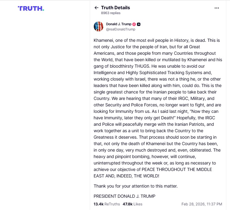 ترامب أوضح عبر منصة تروث سوشال أن خامنئي لم يتمكن من الإفلات من المراقبة، واعتبر أن مقتله يشكل فرصة للشعب الإيراني لاستعادة بلاده كما قال إن معلومات وصلته تشير إلى أن عناصر من الحرس الثوري والجيش وقوات الأمن لم يعودوا راغبين في التعاون مع القيادة الحالية ويسعون للحصول على حصانة أمريكية داعيا إلى اندماجهم سلميا مع المواطنين للعمل على إعادة الاستقرار.